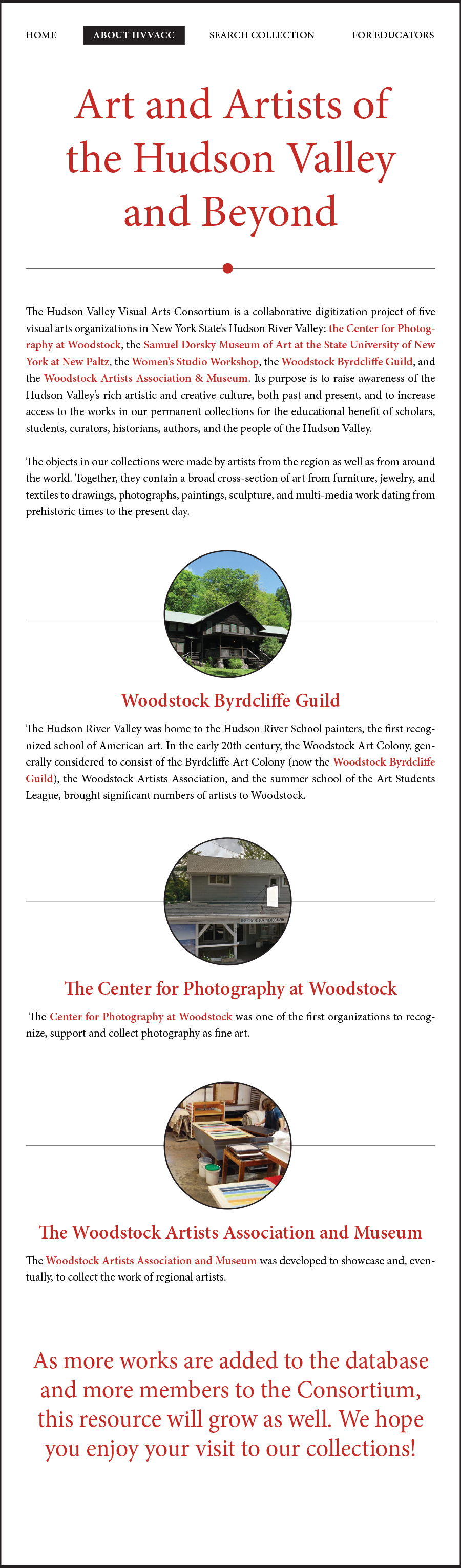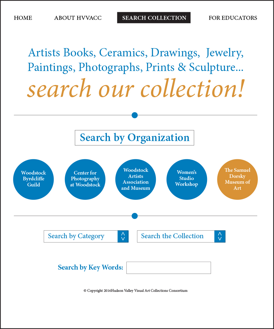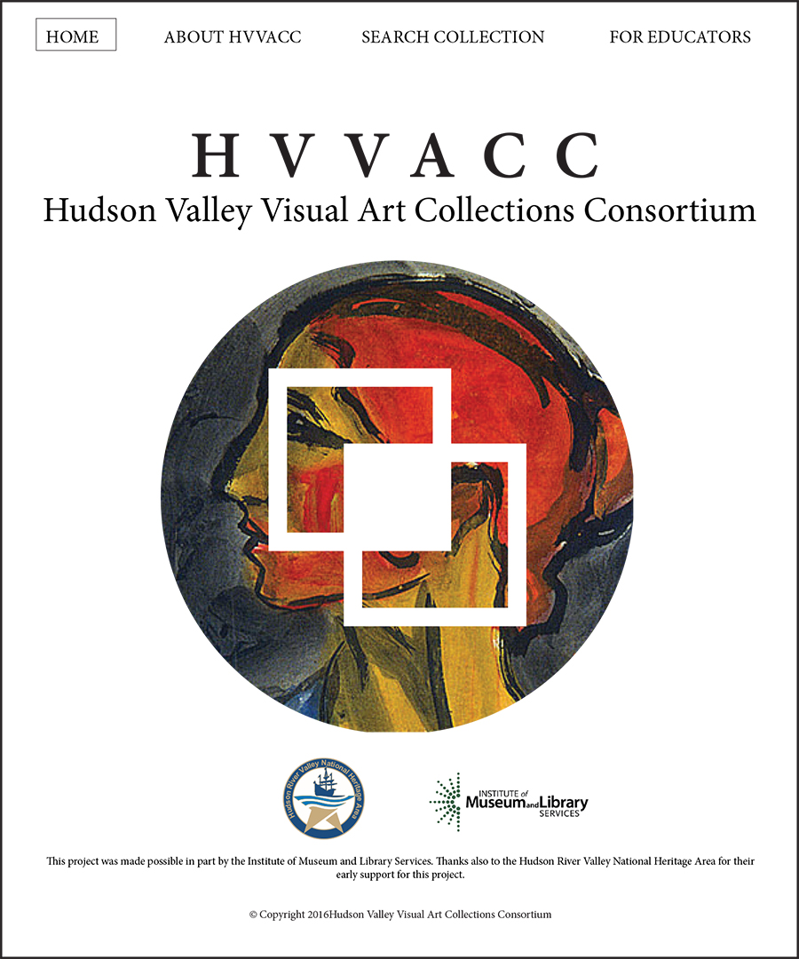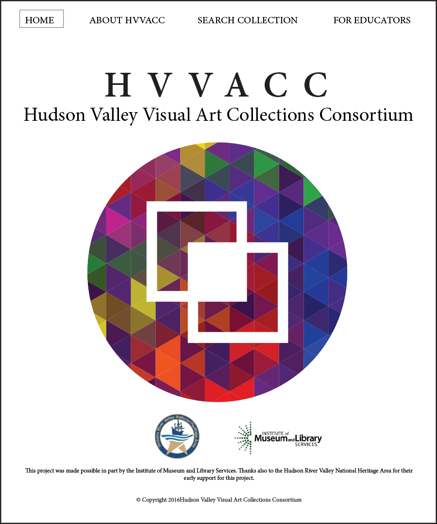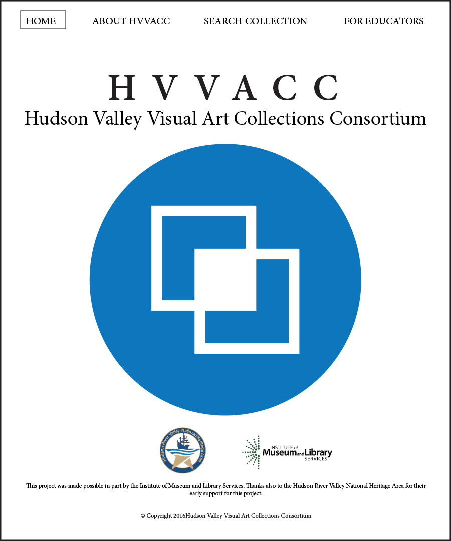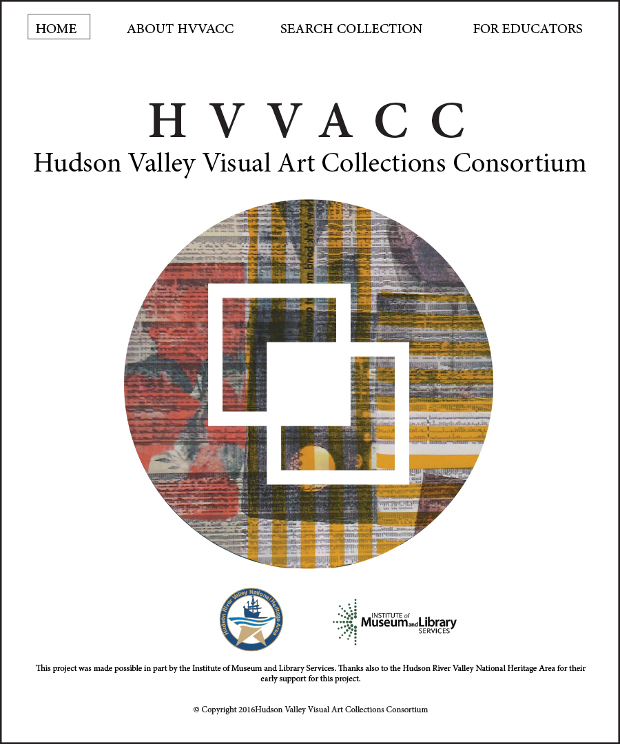 The Hudson Valley Visual Art Collections Consortium HVVACC was developed to facilitate collaboration among five organizations and, in particular, to make their collections available for online viewing and research. Working directly with the Director of the Samuel Dorsky Museum of Art and the museum’s marketing council, I am currently working on a redesign of the Consortium’s logo and website. Their wish is to have a clean background on the site, allowing the artwork to stand out and be adequately featured without any clutter. This reasoning filters down to secondary pages as well. The main logo will feature the circle filled with pms639. On the website, the logo will feature a different image in the circle every time the viewer accesses the website or refreshes the site. The two outlines of squares represent the merging of the various collections. The solid square in the middle represents the “new” that evolves out of the sharing of collections.